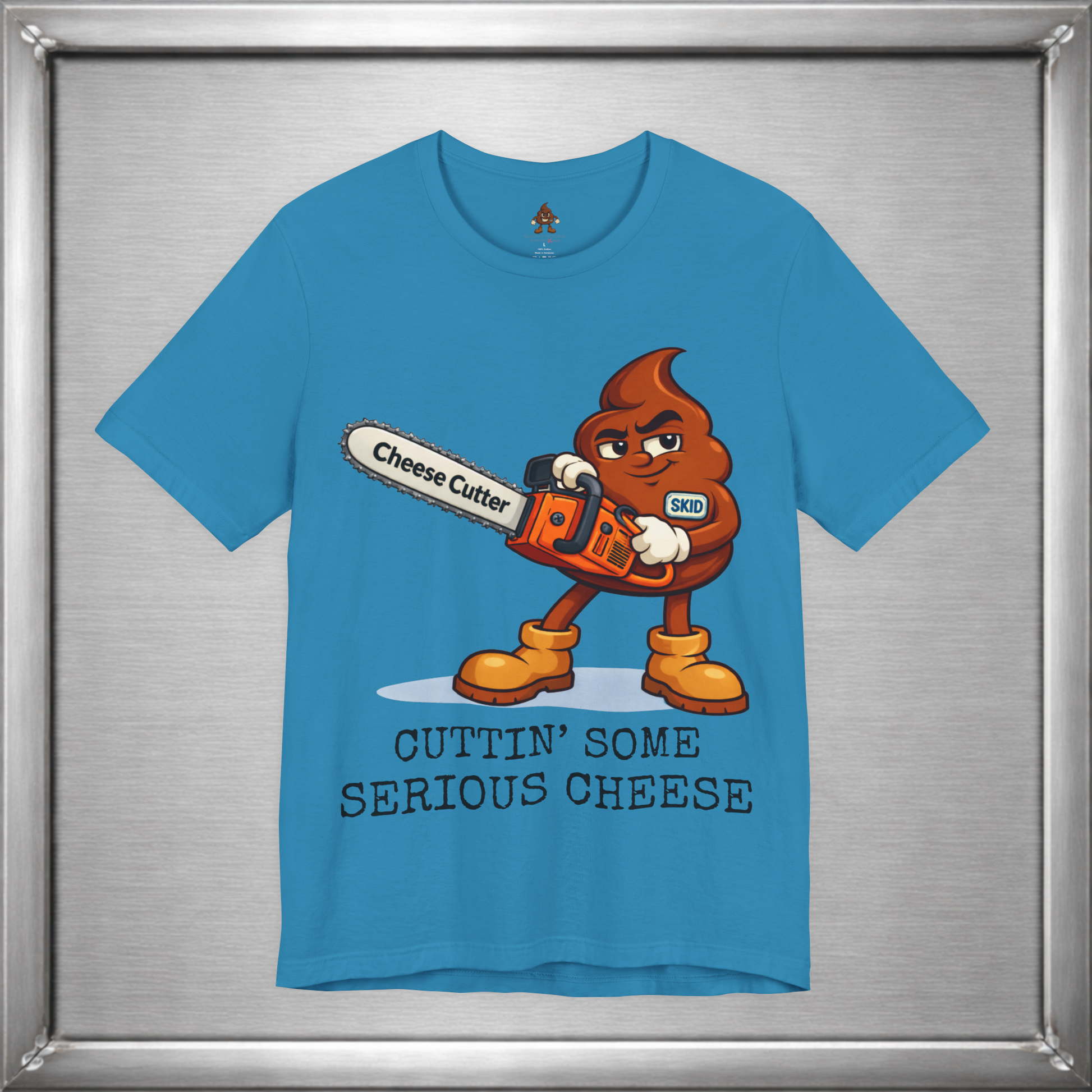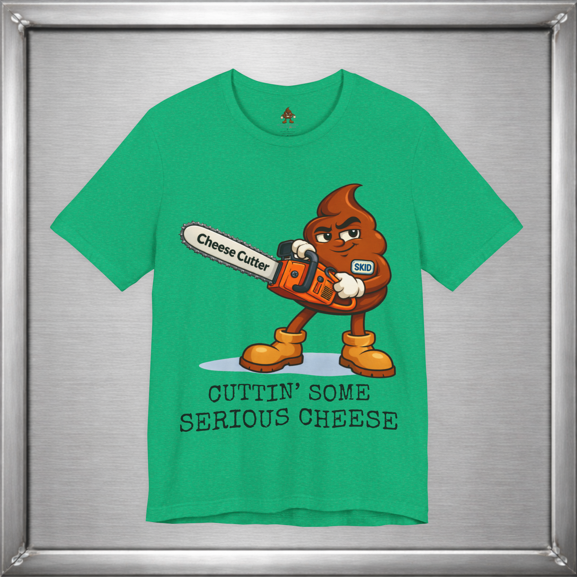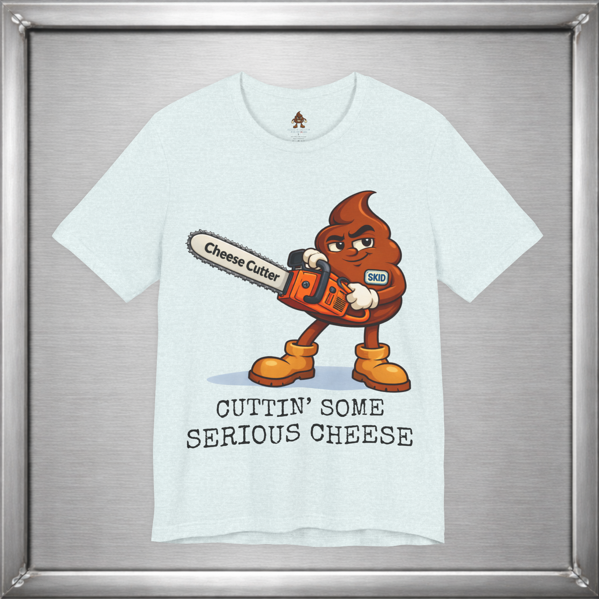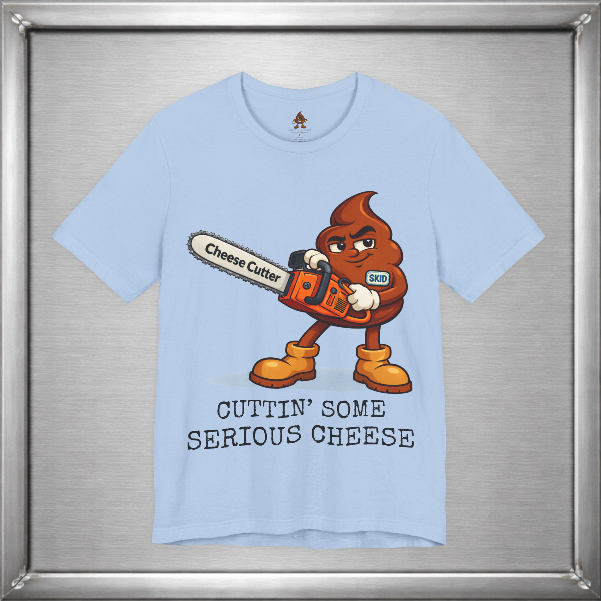 🧀 When subtlety fails, Skid reaches for power tools. This design takes the ancient art of “cutting the cheese” and upgrades it with a full-throttle chainsaw labeled Cheese Cutter, because sometimes the joke deserves industrial strength. It’s crude, deliberate, and unapologetically stupid in exactly the right way.