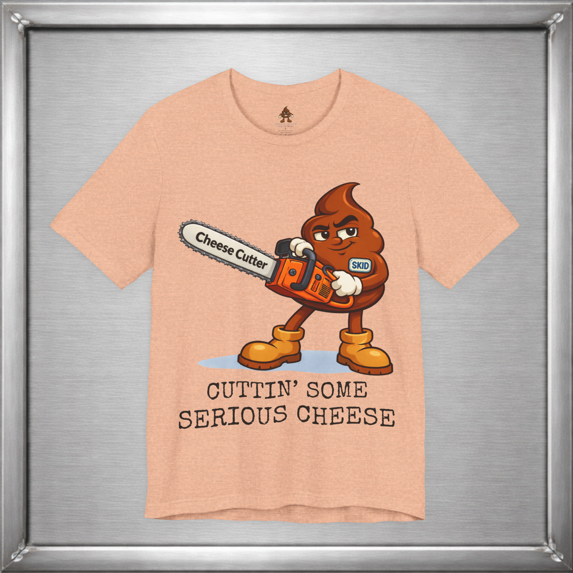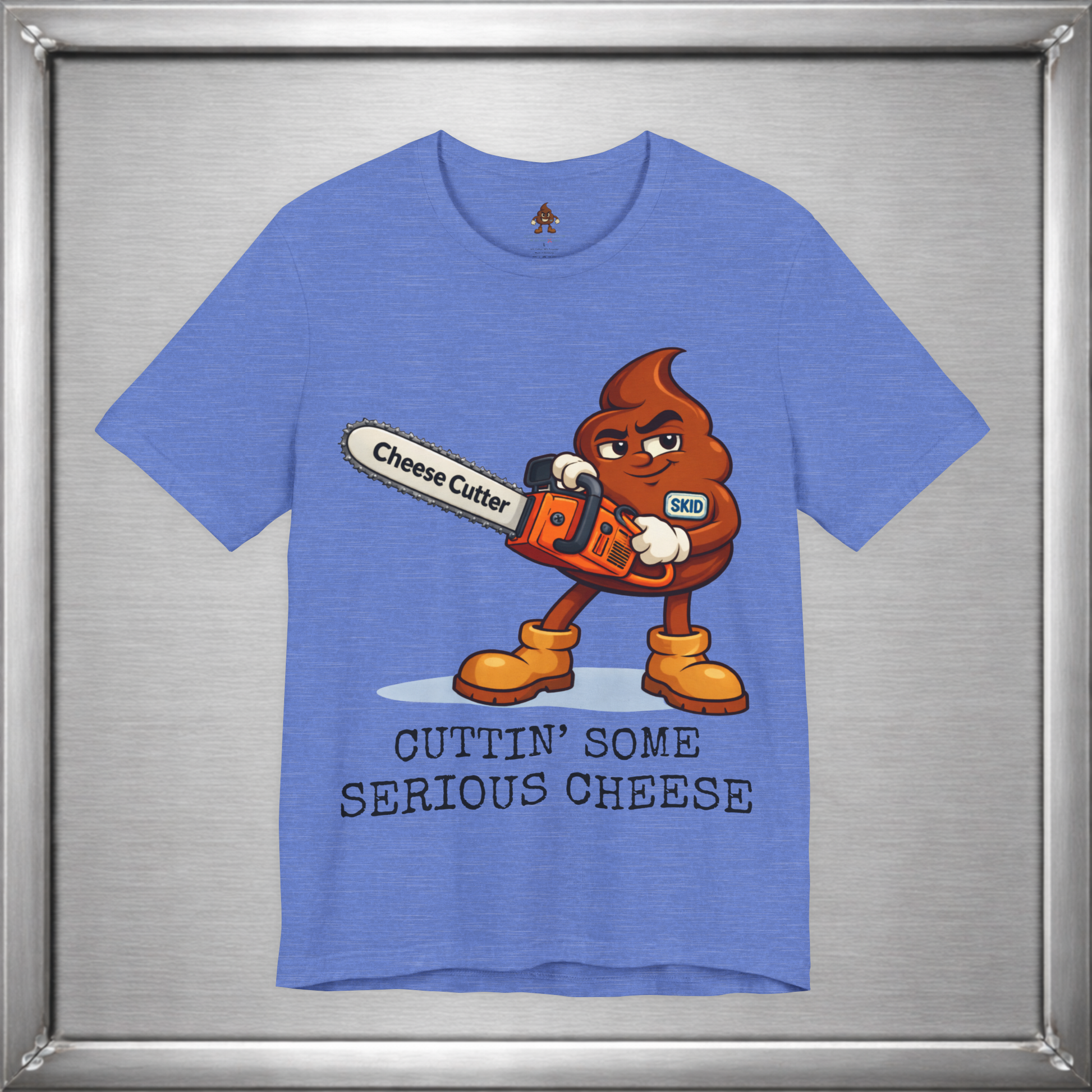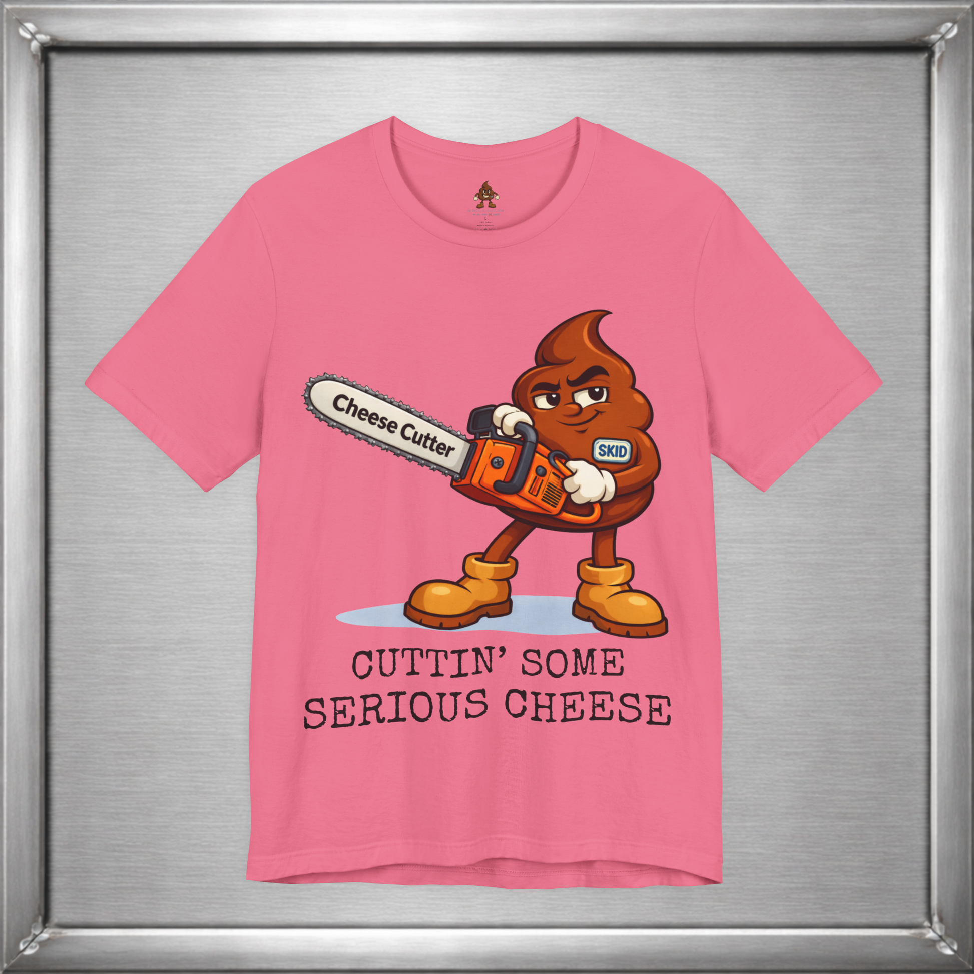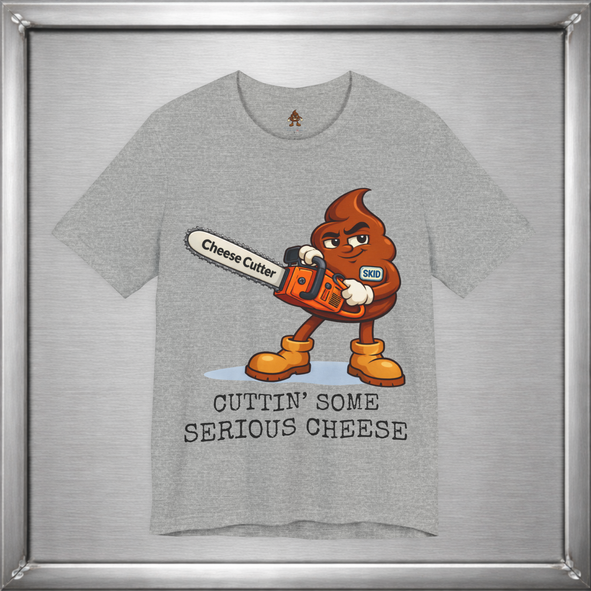 🧀 When subtlety fails, Skid reaches for power tools. This design takes the ancient art of “cutting the cheese” and upgrades it with a full-throttle chainsaw labeled Cheese Cutter, because sometimes the joke deserves industrial strength. It’s crude, deliberate, and unapologetically stupid in exactly the right way.