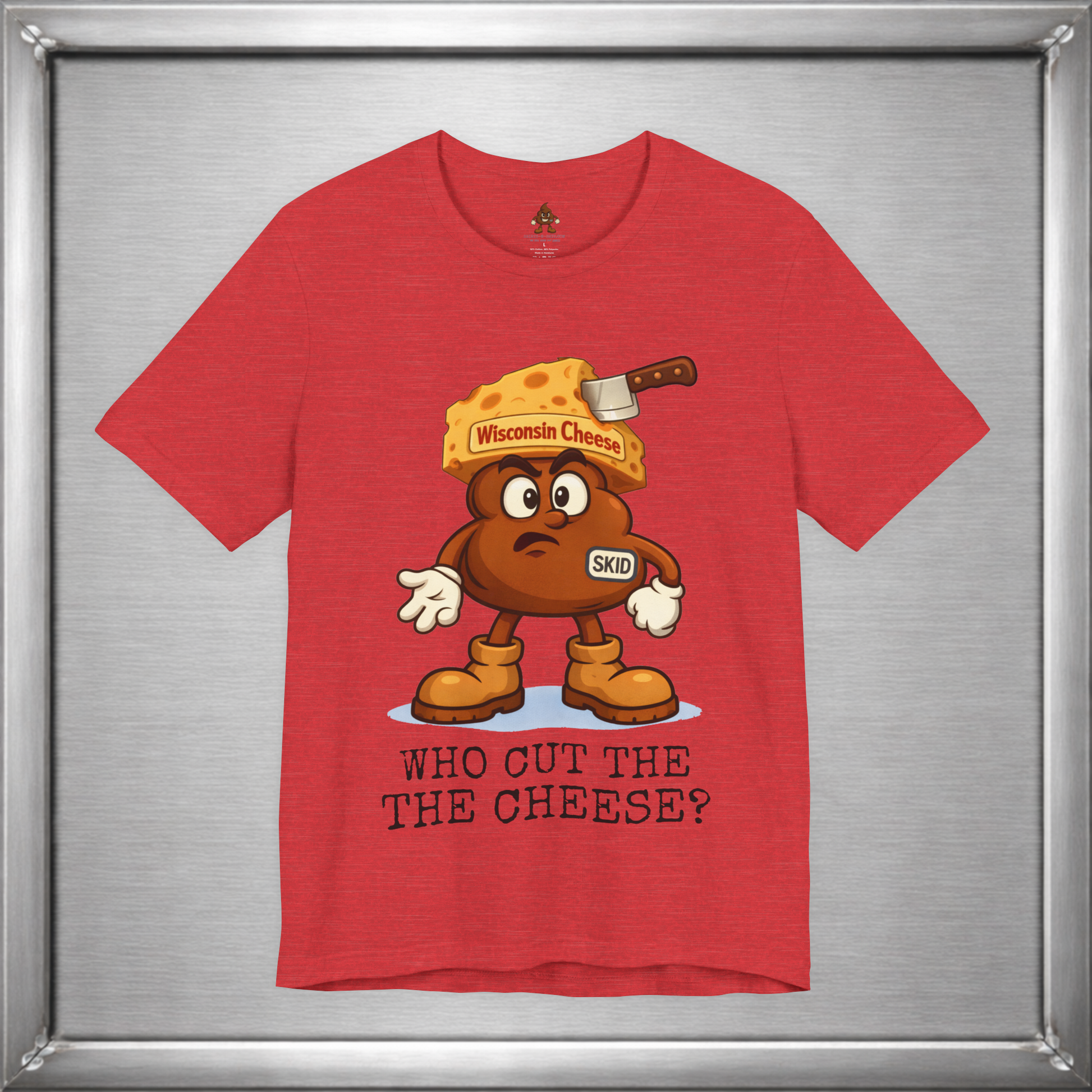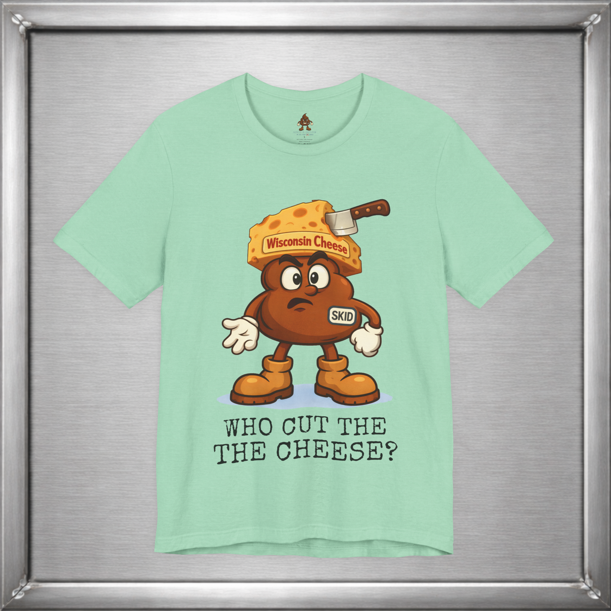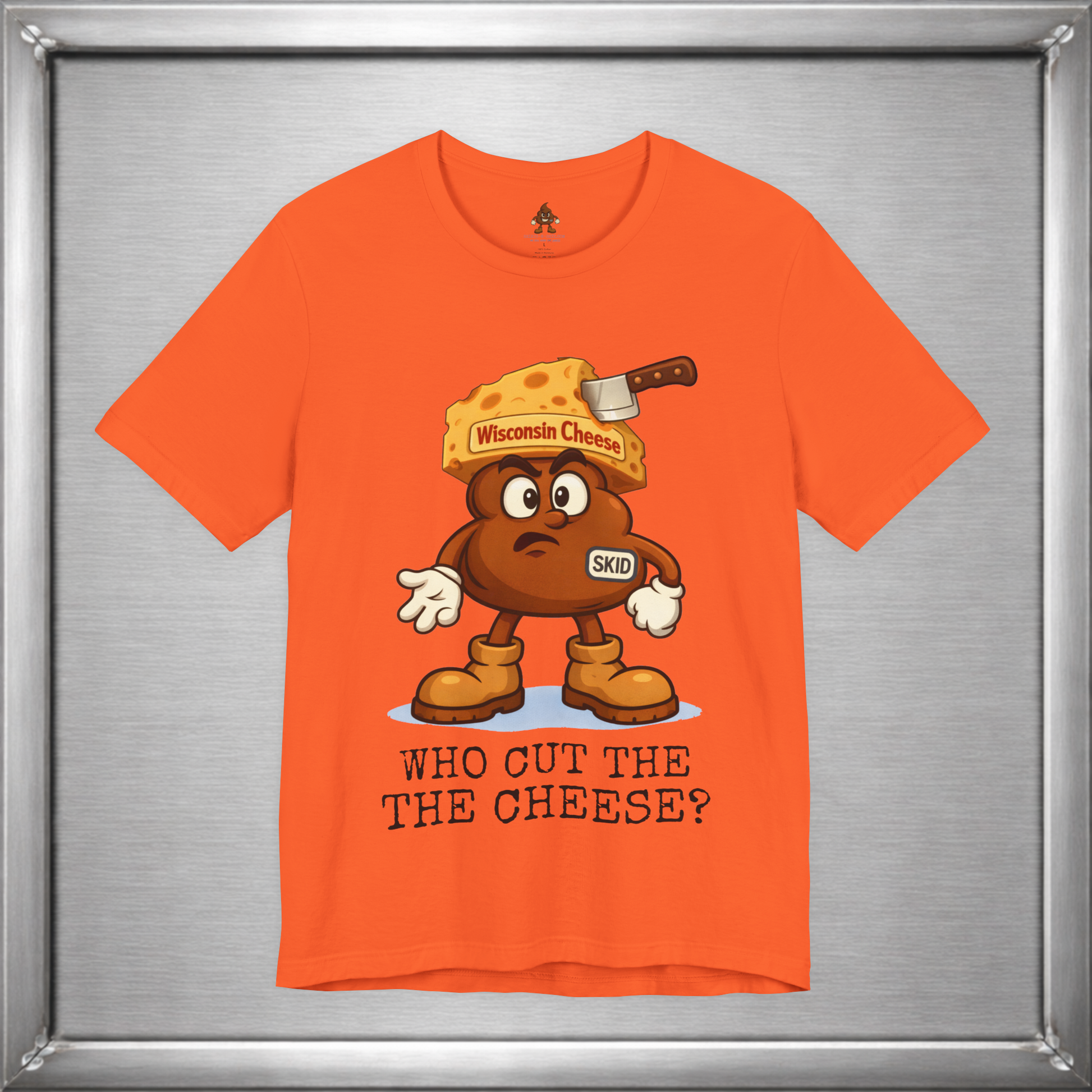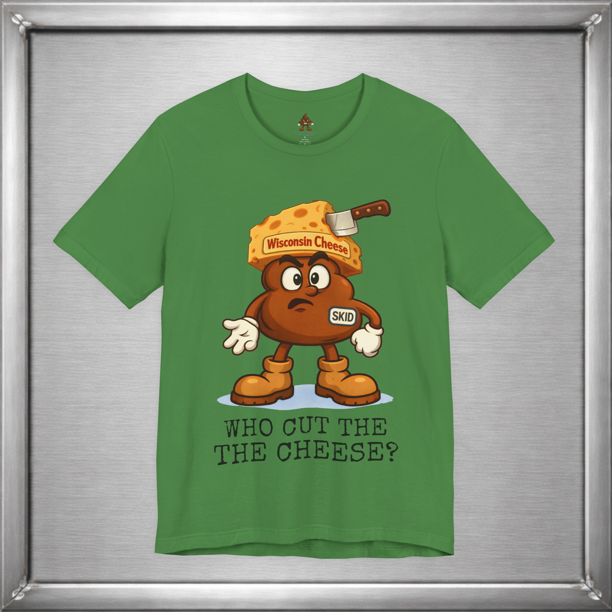 🧀 In Wisconsin, cheese is a lifestyle—and sometimes a side effect. Skid knows this. Wearing a proud wedge of Wisconsin Cheese and that familiar “who cut it?” expression, this design leans into the age-old truth that loving cheese often means living with the consequences. Some traditions are cultural. Some are digestive.