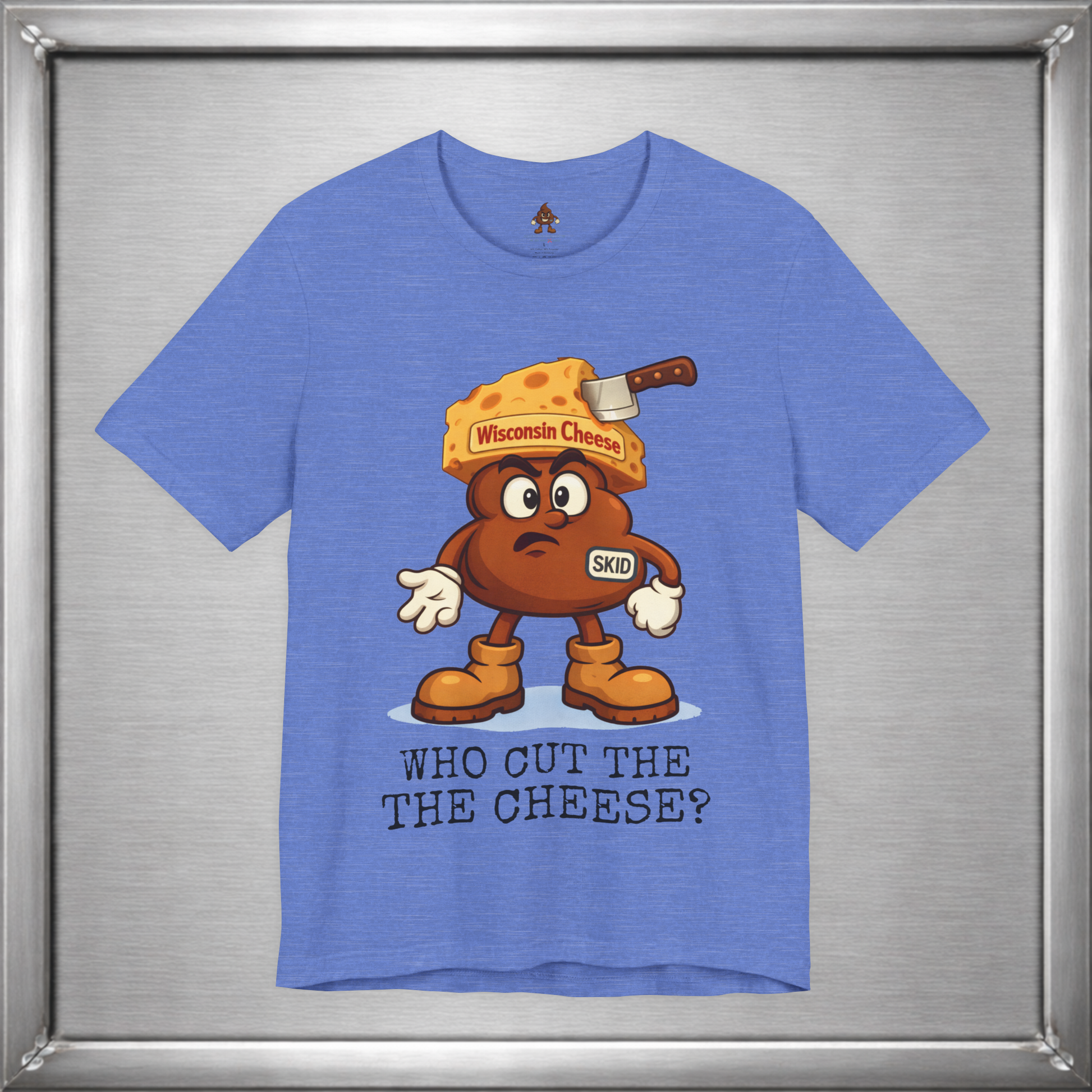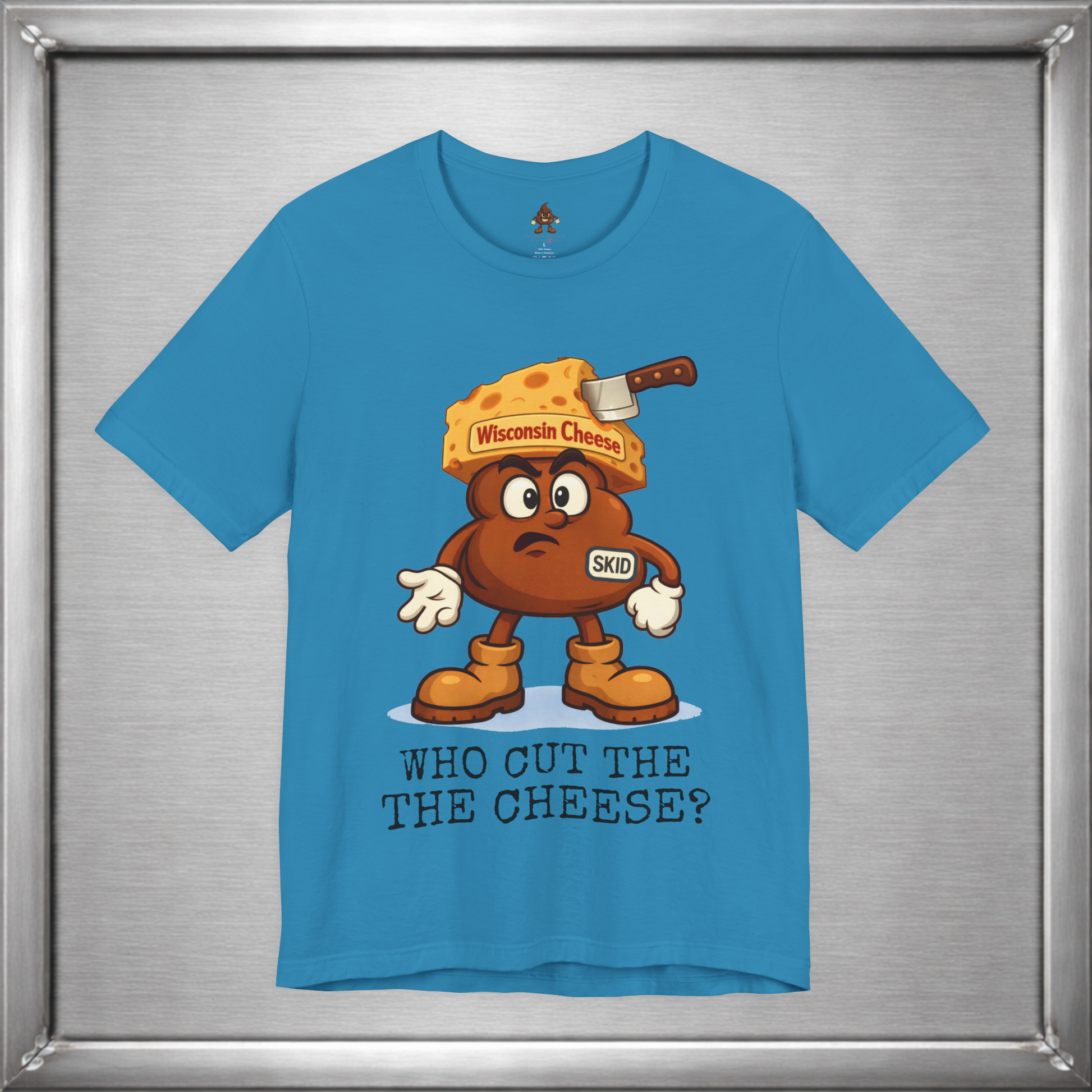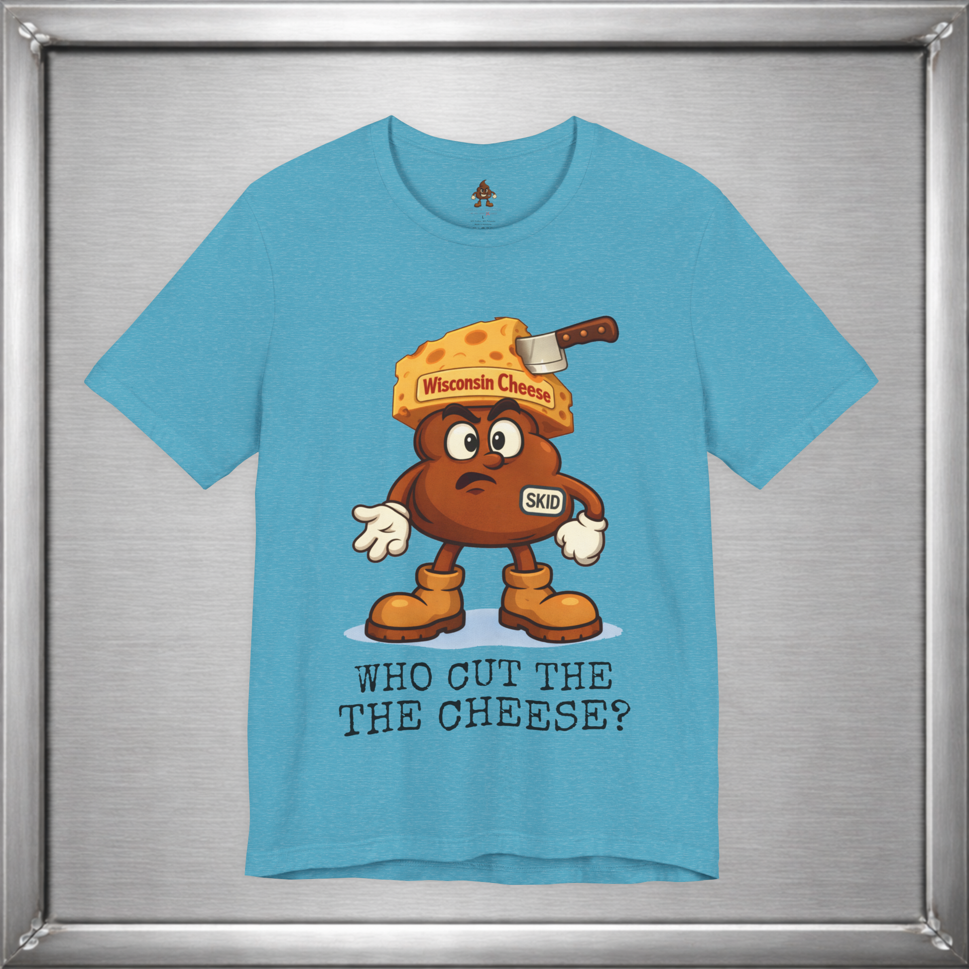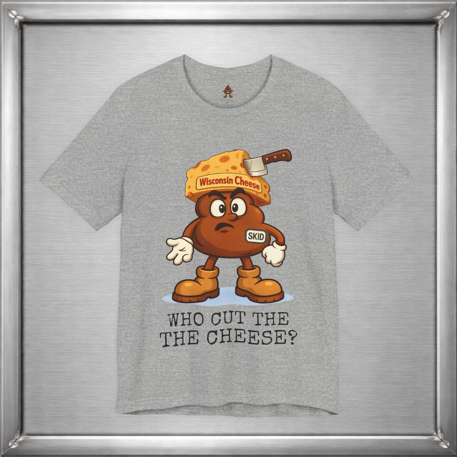 🧀 In Wisconsin, cheese is a lifestyle—and sometimes a side effect. Skid knows this. Wearing a proud wedge of Wisconsin Cheese and that familiar “who cut it?” expression, this design leans into the age-old truth that loving cheese often means living with the consequences. Some traditions are cultural. Some are digestive.